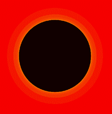 One way to visualize the dynamics of the map on the plane is to color points in the complex plane based on whether they escape to infinity or stay in a bounded region for all time. We can color points in the complex plane based on what their long-term behavior is. We can color points that stay bounded one color, and color the points that escape based on how quickly they escape. Here, we will color the points that do no escape black, but other programs may color them differently. The set of points that do not escape is called the filled Julia set, and the boundary of the filled Julia set is called the Julia set. Because of the fact that far enough away from the origin of the complex plane, points always escape, we know that everything of interest is happening in a small region around the origin, and this is all that is usually drawn.