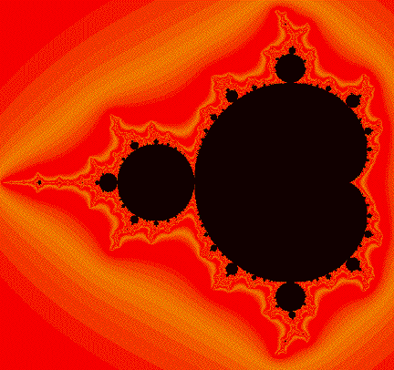 The following is a picture of the Mandelbrot set colored in black. The points not in the Mandelbrot set are colored according to how quickly the point