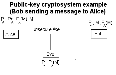 Figure 2: With the public-key model, Alice freely distributes her public key PA, so both Bob and Eve know it. However she keeps her private key, PrA, secret (Bob doesnt even know it). Even though Eve knows PA and PA(M), Eve cant recover the message without Alices private key. [Again, letters near each box indicate what each person knows. M is the message Bob sends to Alice (he knows it since he wrote it, and Alice knows it since she has deciphered it). PA(M) represents the message enciphered with Alices public key. To get M from PA(M), Alice applies PrA to PA(M).]