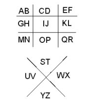 The pigpen cipher is easily remembered by drawing a tic-tac-toe board (or a pigpen) and an X, then writing the letters in as shown below. Each letter is then represented by its position in the diagram; the second letter in each spot is represented by that position and a dot.