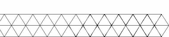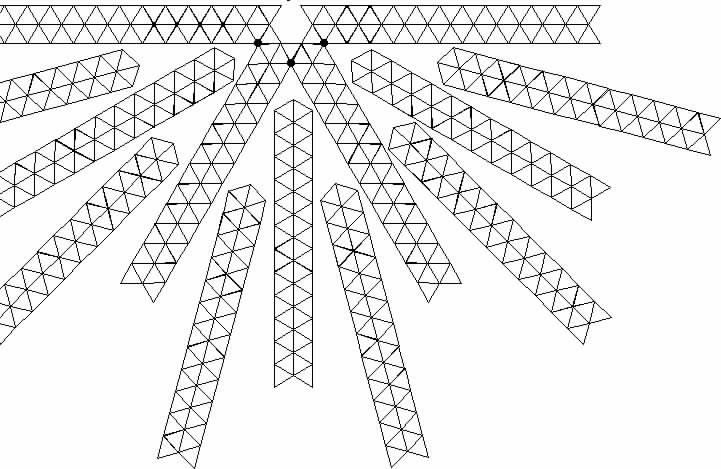 3. The quickest way is to start with many strips as pictured in Figure 6a these strips can be as long as you wish. Then add four of the strips together as in Figure 6b using 5 additional triangles. Next, add another strip every place there is a vertex with 5 triangles and a gap (as at the marked vertices in Figure 6b). Every time a strip is added an additional vertex with 7 triangles is formed.