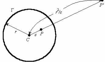 Definition: An inversion with respect to a circle G is a transformation from the extended plane (the plane with ¥, the point at infinity, added) to itself that takes C, the center of the circle, to ¥ and vice versa and that takes a point at a distance s from the center to the point on the same ray (from the center) that is at a distance of r2/s from the center, where r is the radius of the circle. See Figure 11. We call (P,P¢) an inversive pair because (as the reader can check) they are taken to each other by the inversion. The circle G is called the circle of inversion.