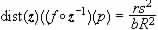 4. By (*), dist(z)(f(z-1(p)) = r/c, where c is the y-coordinate of f(z-1(p)) = f(a,b). To determine c, look at Figure 12. By similar triangles, s/b = (R2/s)/c. Thus c = b(R2/s2) and