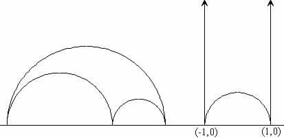 It is impossible to picture the whole of an ideal triangle in an annular hyperbolic plane, but it is easy to picture ideal triangles in the upper half plane model. In the upper half plane model an ideal triangle is a triangle with all three vertices either on the x-axis or at infinity. See Figure 14.