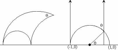 Show, using inversions that all 2/3-ideal triangles with angle q are congruent to the standard one at the right of Figure 15 and thus the area is the double integral: