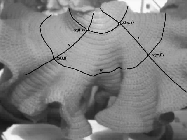 Let r be the fixed inner radius of the annuli and let Hd be the approximation of the annular hyperbolic plane constructed, as above, from annuli of radius r and thickness d. On Hd pick the inner curve of any annulus and calling it the base curve, pick a positive direction on this curve, and pick any point on this curve and call it the origin O. We can now construct an (intrinsic) coordinate system xd: R2 ® Hd by defining xd(0,0) = O, xd(w,0) to be the point on the base curve at a distance w from O, and xd(w,s) to be the point at a distance s from xd(w,0) along the radial (along the radii of each annulus) curve through xd(w,0), where the positive direction is chosen to be in the direction from outer- to inner-curve of each annulus. See Figure 8. The reader can easily check that this coordinate map is one-to-one and onto.