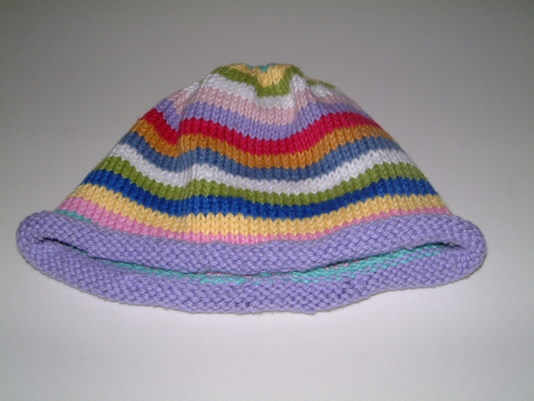 Here's another baby hat. This is just a plain and simple striped hat with double knit cotton yarn. I made a matching sweater as well which you can see Lisa wearing here. The bottoms in the picture are part of an outfit I made out of the same yarn based on the cover outfit in MinnowKnits.