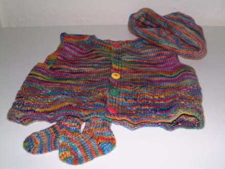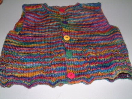 These items are knit with Koigu yarn. I made the socks and hat first, and then I was asked to make a matching sweater. I wanted the sweater to fit for more than a week (at least two) so I didn't want to make it too small. I was unable to track enough of the same yarn for a sweater, so I made a vest. I put lace tulips along the bottom. While these all match, they are all sized to fit at different times. The socks are very small. I gave an identical pair to other friends and they told me that they were the only things they had that were small enough when the baby was born. The hat is larger and the vest larger still.