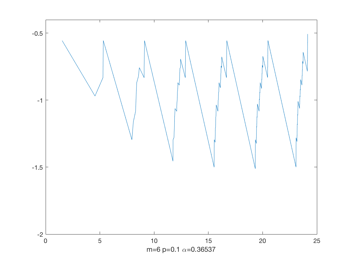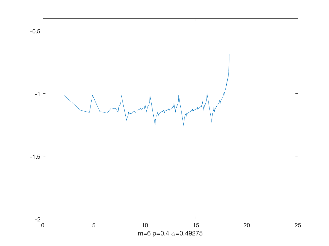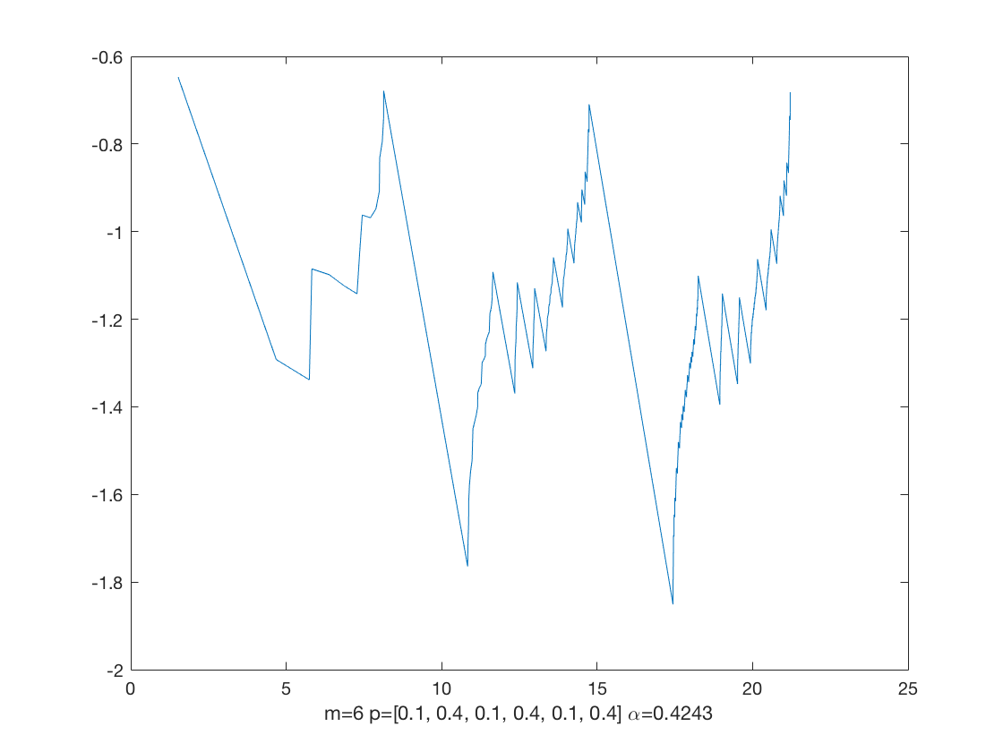 We can generalize our construction symmetric Laplacians by using a sequence of measure parameters instead of just one measure parameter. The below give an example of the Weyl plot for this Laplacian at level 6, by alternating between p=0.1 and p=0.4 at each level. These images and all 64 possible arrangements of p=0.1 and 0.4 on level 6 are available in pdf format here.