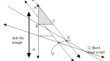 intersection point P of lines QB and AC traces a curve as the triangle slides